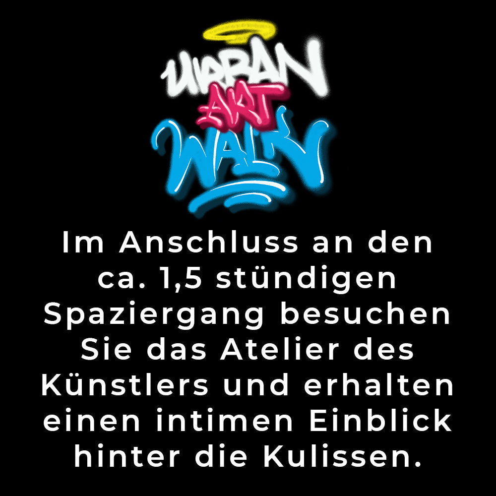 Im Anschluss an den ca. 2 stündigen Spaziergang besuchen Sie das Atelier des Künstlers und erhalten einen intimen Einblick hinter die Kulissen. Bei einem Getränk zeigt Fuego Fatal eine Auswahl seiner Bilder, und stellt seine aktuellen Projekte und Workshops vor. Originalbilder, Drucke und Produkte können vor Ort erworben werden.